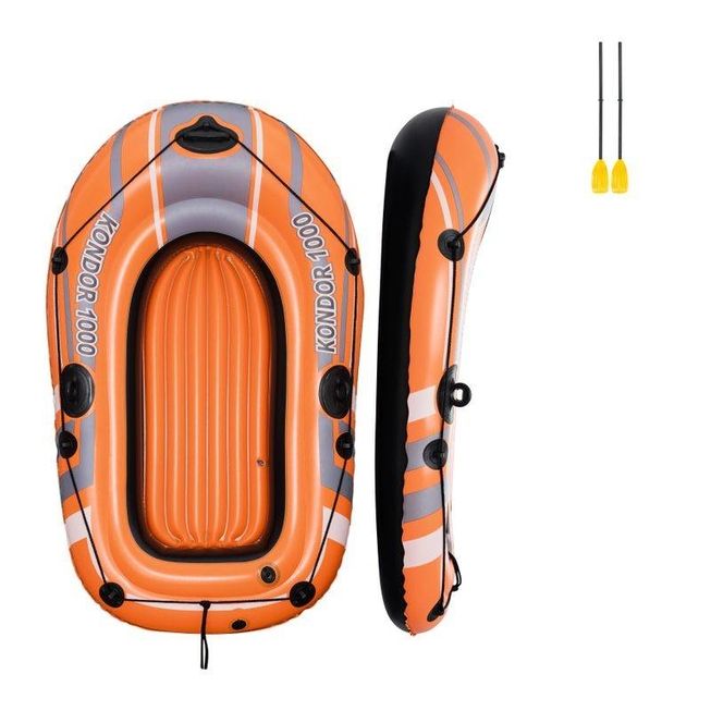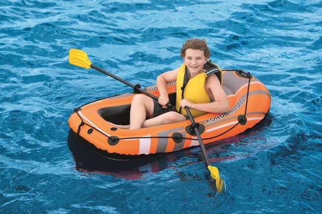 La Bestway® 61" x 37"/155 cm x 93 cm Hydro-Force ™ es una barca hinchable que es genial para los niños. Viene con remos, por lo que está listo para golpear el agua una vez que está inflada. La barca está hecha de un vinilo resistente que ha sido probado previamente. La cuerda de agarre alrededor de los lados está asegurada con arandelas de plástico incorporadas para que el jinete pueda trepar a la balsa si se caen. También hay un asa de cuerda en el frente, por lo que es fácil de transportar alrededor del lago o la piscina. Los ganchos de remo están integrados en los costados de la barca y se combinan con el broche para mantener los remos en su lugar. Los remos (incluidos) miden 49 "/ 124 cm de largo, por lo que puedes deslizarte por el agua rápidamente. Perfecto para niños de entre 6 y 15 años que disfrutan de un día en el lago con su barca hinchable Bestway Hydro-Force Kondor 1000 Set.