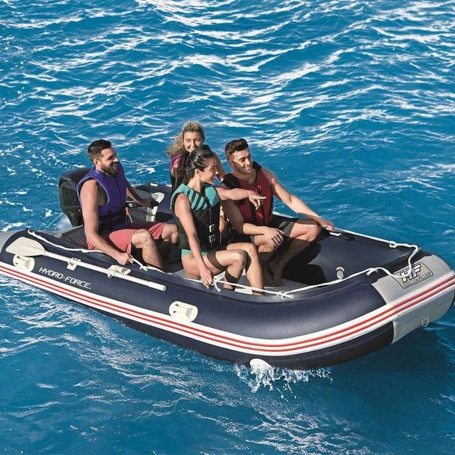 El Hydro-Force ™ Sunsaille Sport Boat es una barca hinchable para 6 personas, listo para aventuras de fin de semana o para un uso constante a largo plazo. Las tablas del suelo de aluminio proporcionan suficiente espacio para sentarse para toda la familia y crean una superficie antideslizante de usos múltiples. Para obtener potencia adicional, se puede colocar un motor de 25 HP en el soporte del motor que está apoyado por un travesaño de madera contrachapada de calidad marina. La construcción de 3 cámaras de aire le da a la Sunsaille una mejor flotabilidad y estabilidad y disminuye el impacto de una sola perforación.